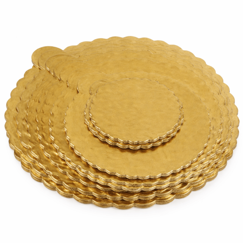 Altın yuvarlak pasta altlığı, mukavva taban üzerine uygulanan özel altın kaplama sayesinde hem estetik hem de dayanıklı bir sunum çözümüdür. Yuvarlak formu, klasik pasta tasarımları ile mükemmel uyum sağlar ve ürünlerinizin daha düzenli ve şık görünmesine yardımcı olur.
